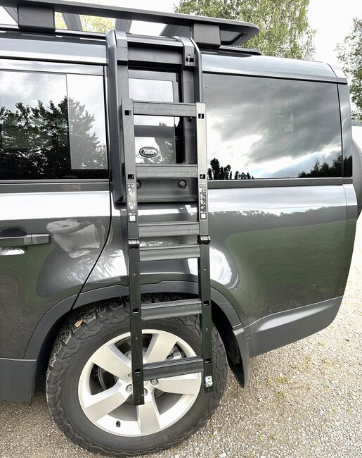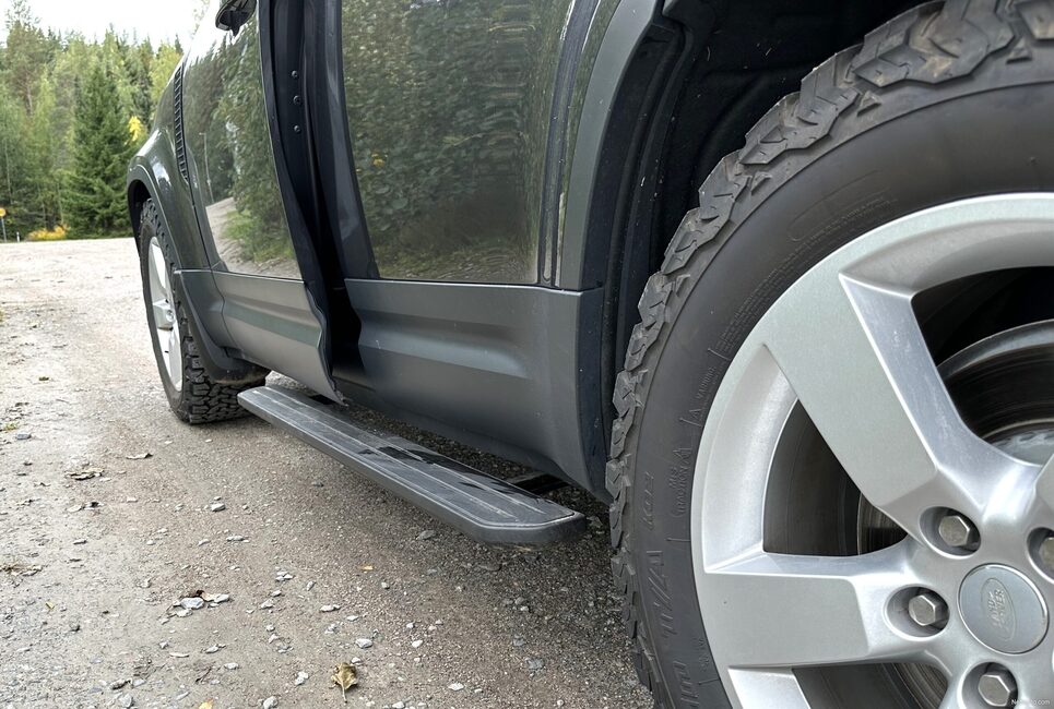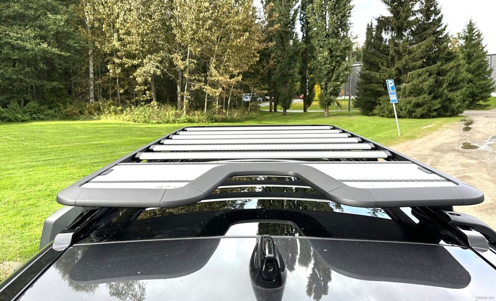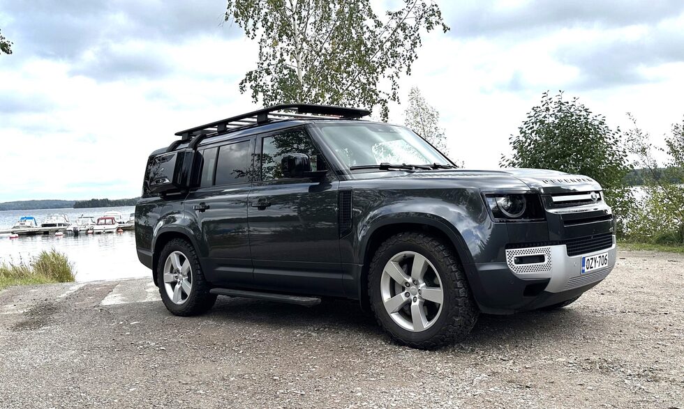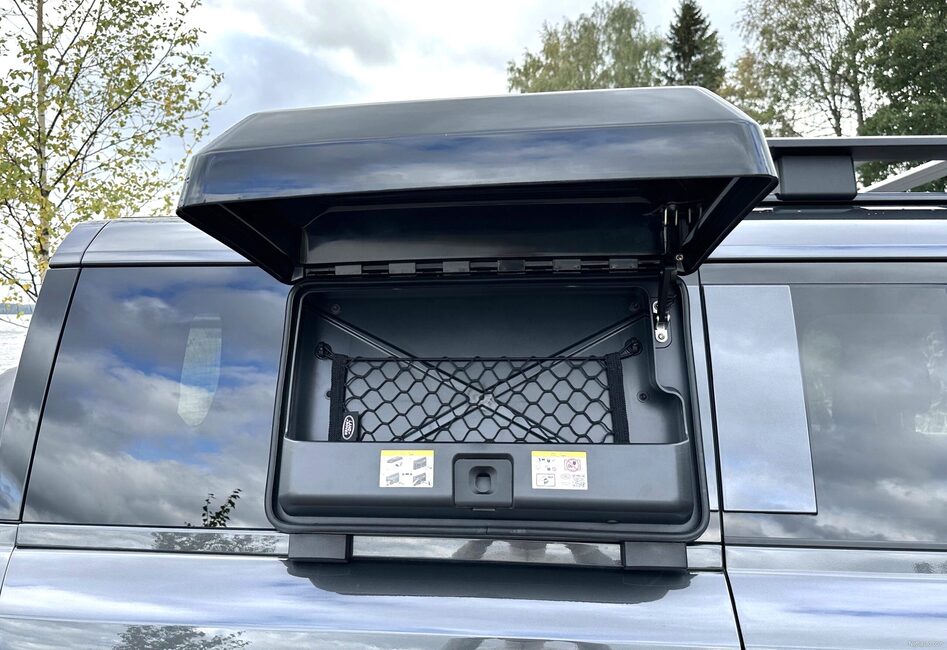 Defenderin varustelu on muutenkin erittäin monipuolinen ja ominaisuuksiin tutustuminen vie aikansa. Koeajoautoversion kattauksesta mainittakoon esimerkiksi panoraamaikkuna, puhelimen langaton lataus, esiin taittuvat astinlaudat sekä iso kosketusvärinäyttö. Ulkoisesti varustelussa huomion kiinnittää 300 kilon kantavuuden kattoteline, jonka käytettävyyttä lisäävät taitettavat tikkaat kuljettajan puolen takarenkaan kohdalla. Apukuljettajan puolen takaosassa on puolestaan lukittava kotelo, jota voi käyttää vaikkapa märkien tai likaisten varusteiden säilytykseen tai vaikkapa ajoviiman mukavasti viilentämien juomien kuljetukseen.