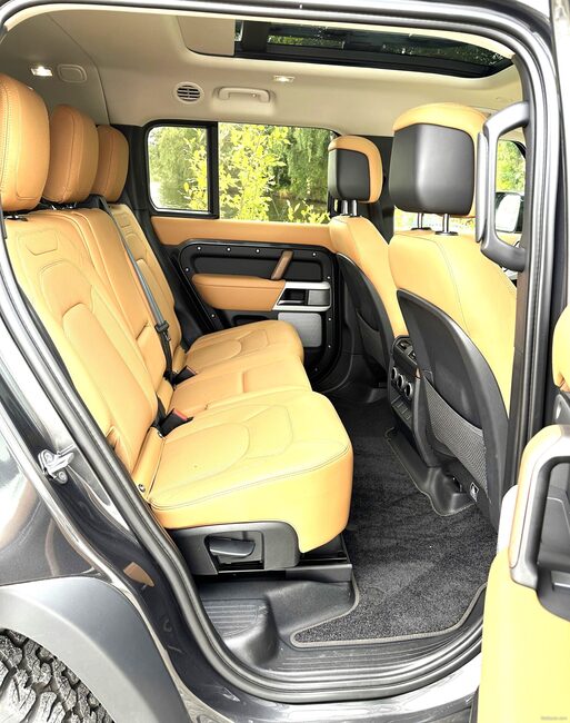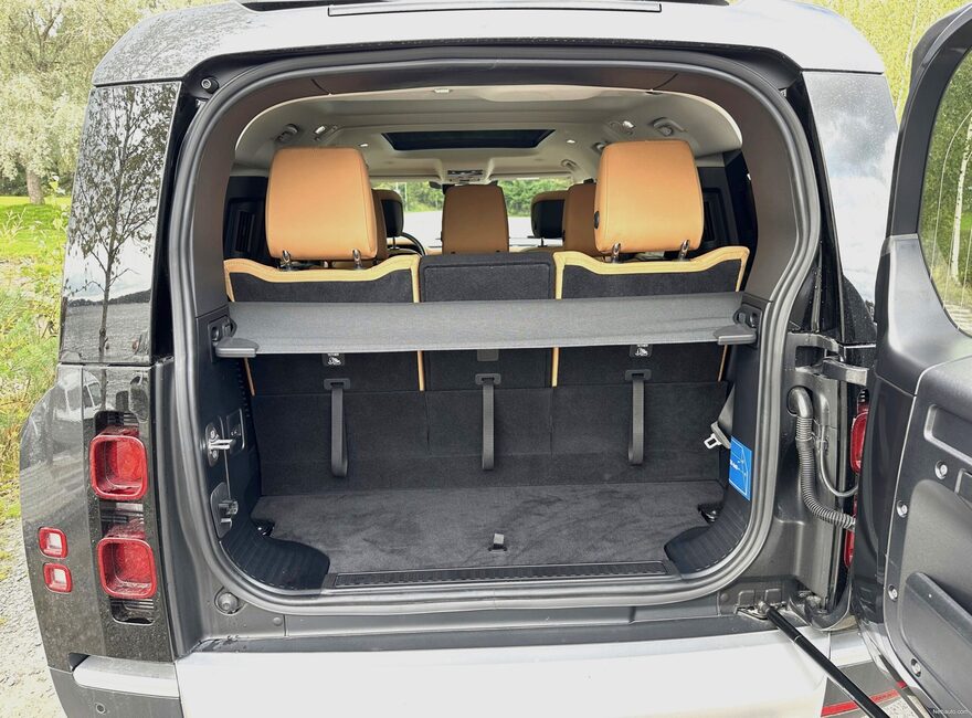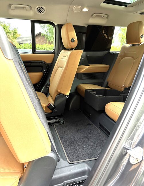 Viisi henkilöä matkustaa Defenderissä ylellisesti ja takaosaston kaksi lisäpaikkaa tuovat myös positiivisen yllätyksen. Yleensä nämä istuimet ovat lähinnä lapsille lyhyeen matkantekoon tarkoitettuja, mutta Defenderissä helppo sisäänpääsy sekä istuinten mitoitus riittää myös aikuisille, ja nahkaistuin mukitelineineen tekee matkustuksesta nautittavaa myös takaosastossa. Tavaratilan koko jää seitsenpaikkaisessa versiossa kohtuullisen pieneksi, mutta jos viisipaikkaisuus riittää, on Defender saatavana myös kuljetustarpeiden mukaisesti yksilöllisesti varusteltuna myös tavaratilan osalta. Luonnollisesti myös istuimet alas taittamalla lisätilaa saa nopeasti ja helposti jopa yli kahden metrin pituiselle materiaalille.