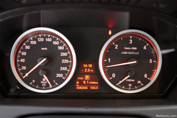X6:n sisusta on hienoinen pettymys. 2000-luvun alkupuoli on edelleen näkyvissä mittaristoissa. Kulutus- ja polttoainemittarit ovat analogisia ja auttamatta vanhan oloinen mittaristo on valaistu puna-oransseilla sävyillä.