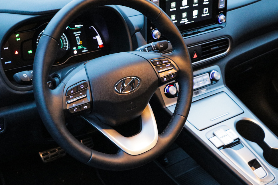 Sisusta on muiden käyttövoimien tavoin moderni ja tyylikäs. Vaihdevalitsin on toteutettu painonapeilla, mikä on tyylikäs ja samaan aikaan varsin toimiva ratkaisu. Sähköpeliksi Kona paljastuu myös mittaristosta, josta uupuu luonnollisesti kierroslukumittari.