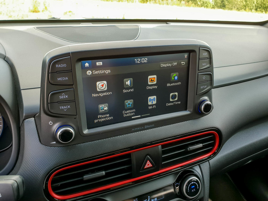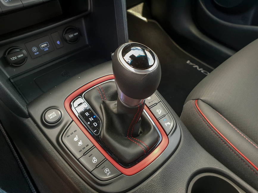 Sport-asennolla käytössä on koko tehoreservi ja kaksoiskytkimellinen laatikko vaihtaa pykälää tiuhaan, sekä pitää kierrokset korkealla. Se valmistautuu rivakoihin kiihdytyksiin ja reagoi niihin viiveettä. Mikään karmea GTI-tykki Kona ei ole, mutta suorituskykyinen se kuitenkin on.