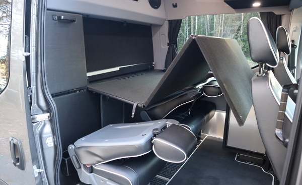 Matkailuauton vaatima makuualusta on normaalitilanteessa laskostettuna väliseinään. Takapenkit alas kaadettuna se saadaan ”makaamaan” penkkien päälle omien, irrallisten tukien varaan. Tilaa on välttävästi kahdelle aikuiselle. Ehkei tarjolla ole sitä maailman parasta punkkaa, mutta verottajan kriteerit täyttyvät, se riittää.