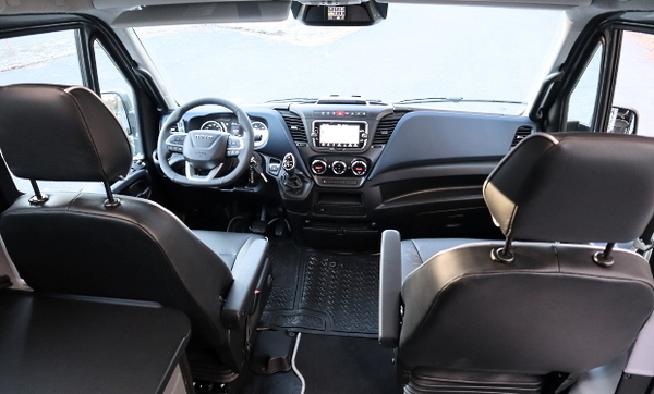 Tyypillisestä pakettiautosta poiketen retki-Dailyssä on ohjaamossa erillisistuimet. Koeajetussa autossa ne olivat tyylikästä ja paksua nahkaa. Sama verhoilumateriaali oli käytössä myös matkustamon istuimissa. Auto on rekisteröity viidelle, joista jokainen matkustaa hyvin tiloin varustettuna. Kaikki istuimet ovat tukevaa ”linja-autokamaa”.