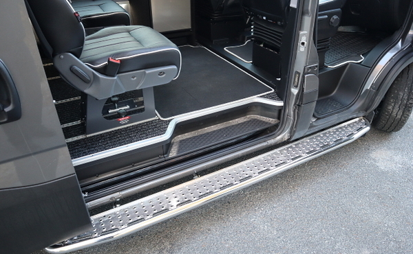 Ohjaamoon kiipeämistä ovat helpottamassa ruostumattomasta teräksestä valmistetut astinlaudat. Auton oikealla puolella se kattaa myös liukuoven.