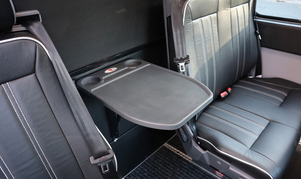 Vaadittava jääkaappi (12 V) on kuljettajan istuimen takana ja se on sijoitettu hieman irti lattiasta, jolloin takana olevalla penkillä istuvan jalat mahtuvat jääkaapin alle, ja matkustaminen penkillä onnistuu. Jääkaapin päällä on ruokapöytä/kirjoitustaso sekä muutama 230 voltin pistorasia ja usb-liitin nykyelektroniikan lataukseen. Takapenkkien välissä on toinenkin kiinteästi asennettu pieni pöytä. Se taittuu helposti kaasujousella ylös ja alas.