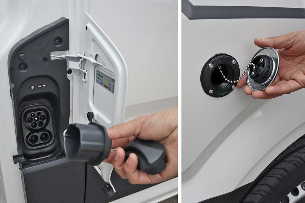 Sähköauton erottaa usein latausluukusta, joka monesti on eri paikassa kuin bensiinin tai dieselin tankkausluukku. Tältäkään osin ei e-Crafteria pysty erottamaan dieselveljistään, koska latauspistorasia on sijoitettu saman luukun alle, jossa tankin korkki on. Yhtä lailla latausluukku lukittuu kuljettajan oven alle. Tosi tarkkasilmäinen voi sentään huomata auton vasemmalla sivulla, takarenkaan yläpuolella olevan täyttökorkin. Se on Suomessa asennettua polttoainekäyttöistä (MPÖ) lisälämmitintä varten. Huoltoasemalla se saattaa herättää hilpeyttä, kun tankkaa sähköautoon polttoainetta, ja vieläpä moottoripolttoöljyä.