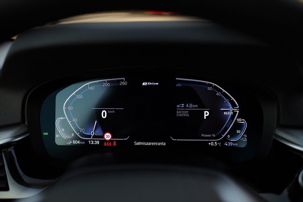 BMW 530e:n akustoon saa virtaan 3,7 kW/h, eli täyteen latinkiin auton saa noin 3,5 tunnissa. Parhaimmillaan toimintamatka on 52 km. Ulkolämpötila toki vaikuttaa sähkön toimintasäteeseen, kuten muissakin ladattavissa, samoin ajotyyli ja maasto. Hybridin kanssa hyytymistä tien päälle ei kuitenkaan tarvitse pelätä.
