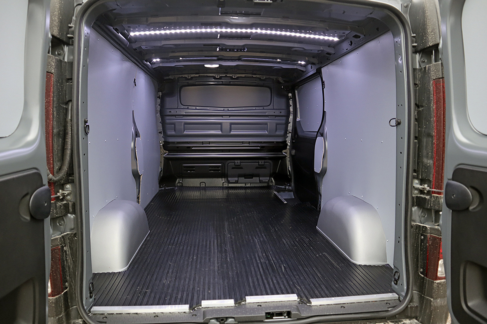 Koeajoauto oli varustettu tavaratilan led-valoilla. Kattoon asennetut valopaneelit tekevät tavaratilasta erittäin hyvin valaistun. Pitkän mallin täysvaneroidun tavaratilan pituus on 2,93 ja leveys 1,64 metriä. Korkeus on 1,37 metriä. Pyöräkoteloiden väliin jää tilaa 1,25 metriä. Läpilastausmahdollisuuden myötä mahtuu mukaan jopa pieni nippu 4,2-metristä lautaa. Läpilastausta varten on väliseinässä saranoitu ja magneeteilla auki lukittuva luukku. Lisäksi matkustajan istuimen alla on toinen avattava luukku. Molemmat luukut avattuna pitkä tavara yltää matkustajan jalkatilaan asti. Suuria määriä ei näin kuitenkaan kuljeteta, mutta jotakin saa sentään mukaan, jos tarve yllättää. Luukkujen avausmekanismit ja penkkien laskostukset ansaitsevat kiitokset. Ne kaikki ovat tukevaa ja kestävää rakennetta.