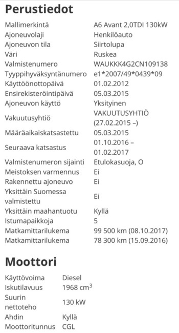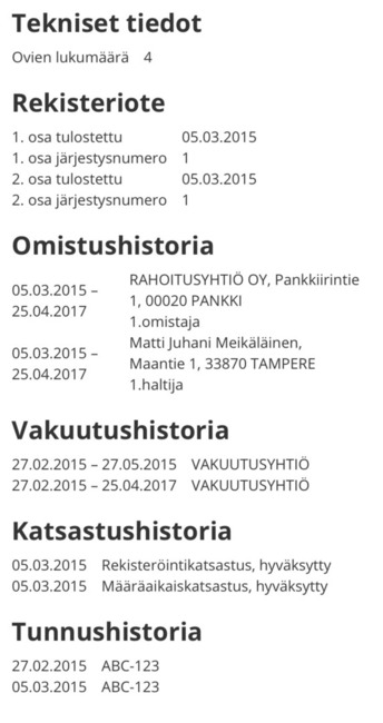 Rekkari.fi-palvelun kautta tilattavista rekisteritiedoista löytyvät kaikki ajoneuvorekisteriin tallennetut tiedot. Voit esimerkiksi todentaa myyjän sinulle antamat tiedot ja hänen oikeutensa myydä ajoneuvoa. Tekniset yksityiskohdat kertovat autosta lisää ja katsatustiedot auttavat hahmottamaan sen kuntoa. Tiedot haetaan suoraan Traficomin järjestelmästä.