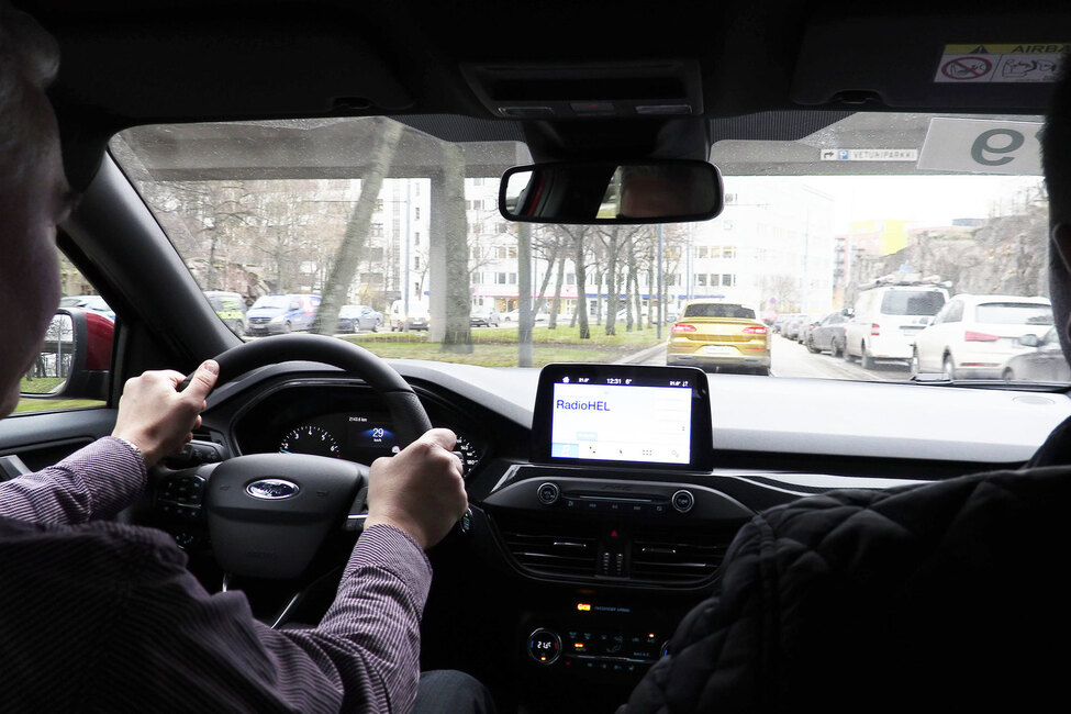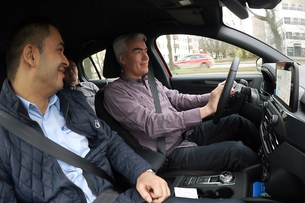 Kyydissä mukana oleva Fordin tuotepäällikkö Dino Singh esittelee matkalla auton ominaisuuksia ja vastaa kysymyksiin.