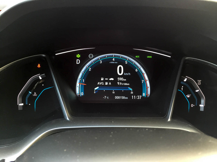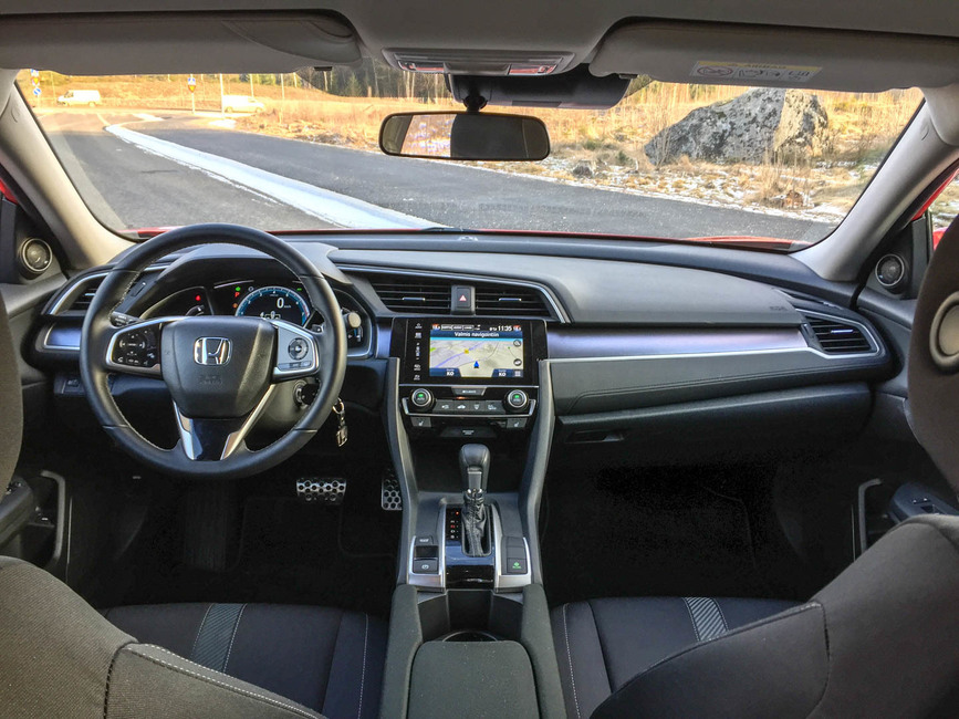Civicin ohjaamossa on mukavaa persoonallisuutta, jolla se poikkeaa valtavirrasta. Honda ei ole lähtenyt puskemaan mallistoaan kohti eurooppalaista suuntausta, mikä on piristävää. Toki yhdessä asiassa se olisi varsin suotavaa: keskikonsolin näytön käyttöliittymä ei ole sieltä kaikkein intuitiivisimmasta päästä.