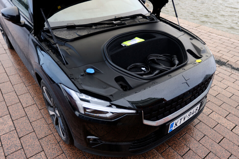 Viisas veto, sillä erityisesti pohjoismaissa, mutta myös muualla kuten Yhdysvalloissa, on paljon ihmisiä, jotka ovat jääneet kaipaamaan Saabia. Polestar 2:ssa on mahdollista saada edes pikkuisen osan Saabia takaisin. Edestä löytyy 35 litran frunkki, joka on aika pieni. Onneksi sentään molemmat latausjohdot mahtuvat etutavaratilaan.