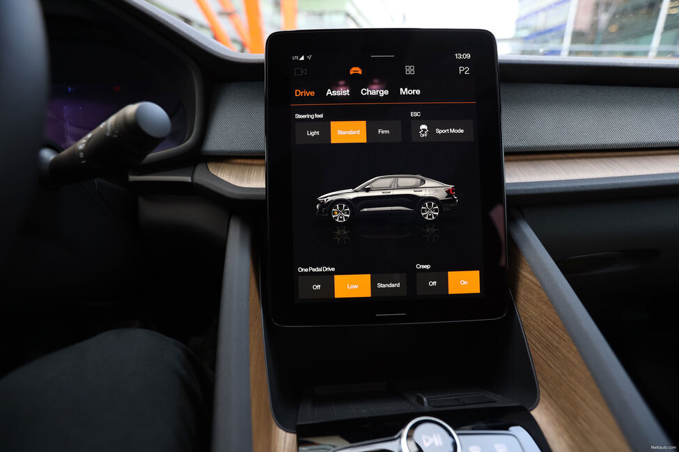 Keskellä kojelautaa on iso pystysuuntaan asennettu kosketusruutu, joka toimii Googlen rakentamalla Android-käyttöjärjestelmällä. Ruutua on helppo käyttää ja sitä voi muokata haluamakseen lataamalla tai poistamalla applikaatioita. Auto on aina yhteydessä nettiin eli sitä varten omaa puhelinta ei tarvitse kytkeä. Auto myös päivittyy otana (Over the Air) eli niin sanotusti kotipihassa.