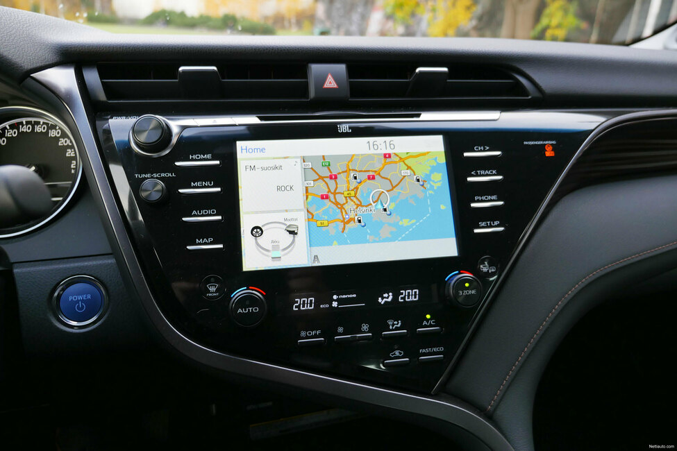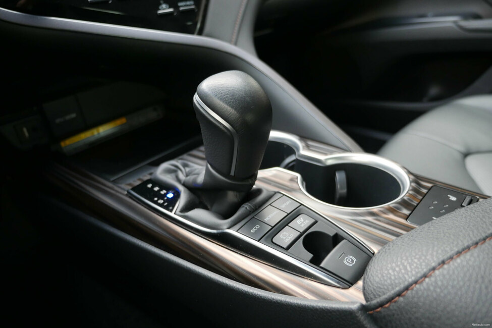 Keskikonsolissa on fiksusti mukitelineet ja vaihdekepin edestä löytyy kännykän langaton latausalusta, USB- ja AUX-liitäntä. Camryssa on muiden Toyotan itselataavien hybridien tapaan ajo-ohjelmien valintamahdollisuus napillla. Eri vaihtoehdot ovat Eco, Normal ja Sport. Lisäksi on EV mode, jolla auton voi kytkeä kulkemaan sähköllä niin kauan kuin akussa riittää virtaa, joka on käytännössä maksimissaan muutaman kilometrin. Kätevä ominaisuus esimerkiksi parkkihallissa paikkaa etsiessä.
