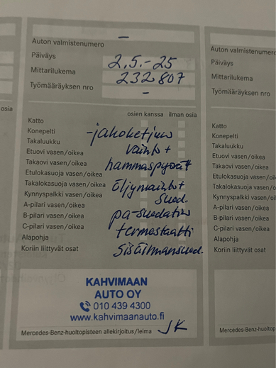 05/2025 - 232tkm,täydellinen ketjuremontti nokkapyörineen, suodattimineen ja kaikkineen