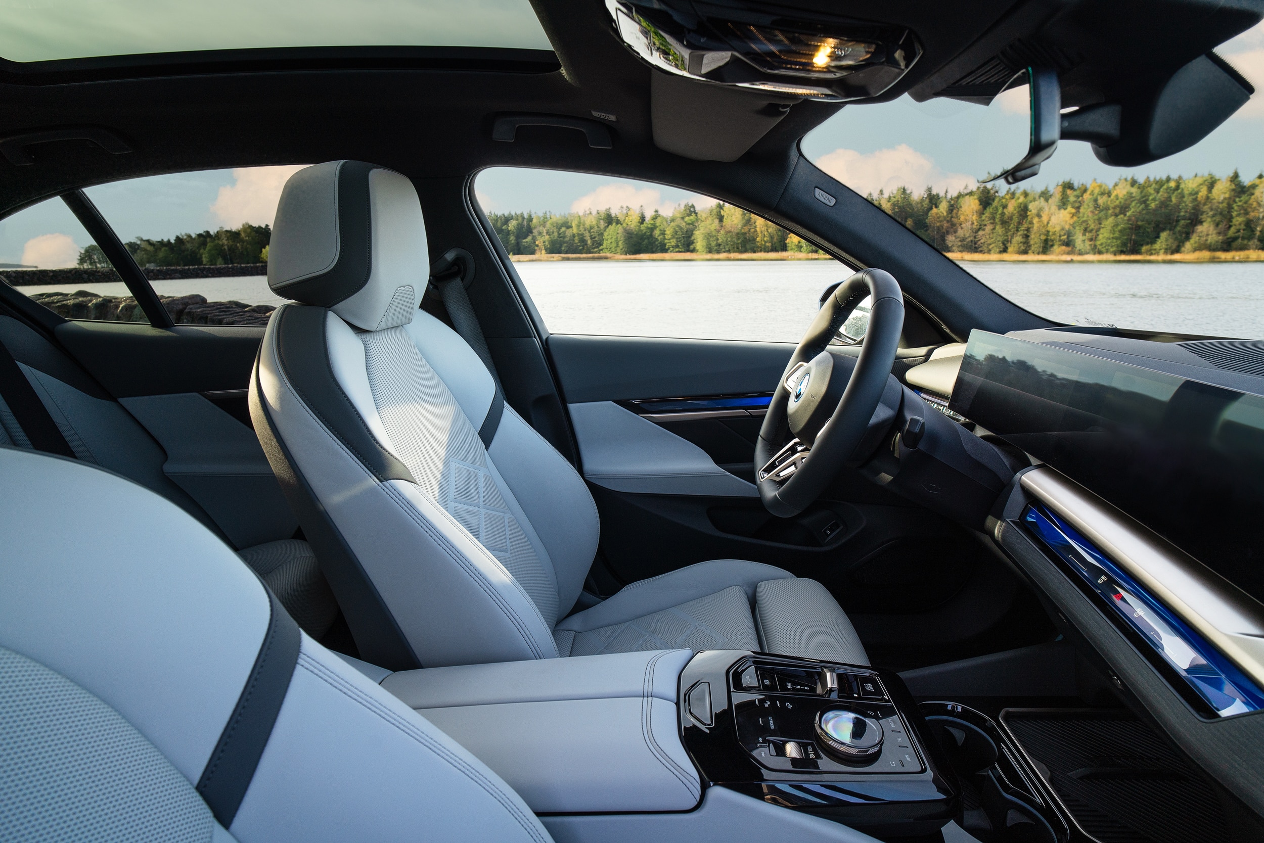 Uuden BMW 5-sarjan ohjaamossa on merkittäviä muutoksia. Painikkeiden ja ohjauspaneelien määrää on vähennetty verrattuna edelliseen malliin. Kaikki autossa toimii nyt intuitiivisemmin. Täysin digitaalinen kaareva näyttöjärjestelmä koostuu 12,3 tuuman- ja 14,9 tuuman ohjausnäytöstä. BMW i5:ssä Interaction Bar on valopaneeli näytön ja ovien välissä. Paneelista voi ohjata muun muassa ilmastointia kosketuspainikkeilla.