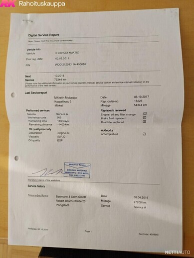 Huollettu säännöllisesti. Sähköinen huoltokirja. 2 viimeisintä huoltoa tehty myöskin autoliikkeessä Maunu Oy, joka on tallentanut huollot sähköisesti, mutta en ole saanut paperista tulostetta.