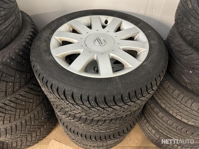Auto on kaksilla renkailla ja vanteilla.