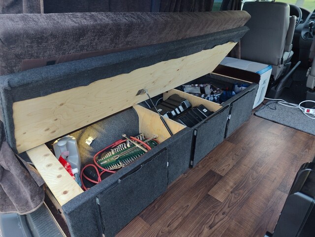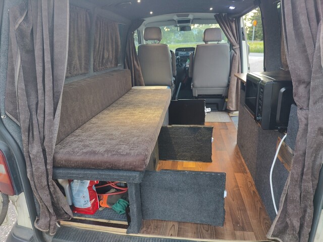 Tavaratilassa kolmen istuttava "vuodesohva", jonka alla säilytystilaa. Levitetyn sängyn päälle mahtuu 140cm leveä patja. Oikealla puolella on pöytä säilytystilalla, lukuvalolla ja mikrolla. Kaikki sivu ja takaikkunat on tummat ja jokaisessa on verhot tankoineen. Lisäksi ohjaamon penkkien taakse ja takaikkunoiden eteen on poikittaiset isot verhot.
